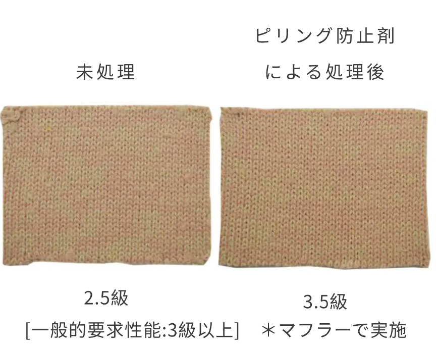 ?ピリング防止剤による加工などを行い、ピリング性能を向上させる(風(fēng)合い等が変化[生地が硬くなる等]するので注意