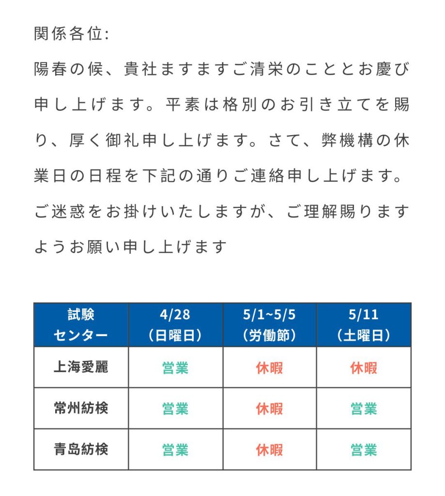 平素は格別のお引き立てを賜り、厚く御禮申し上げます。さて、弊機(jī)構(gòu)の休業(yè)日の日程を下記の通りご連絡(luò)申し上げます。ご迷惑をお掛けいたしますが、ご理解賜りますようお願(yuàn)い申し上げます。